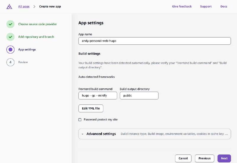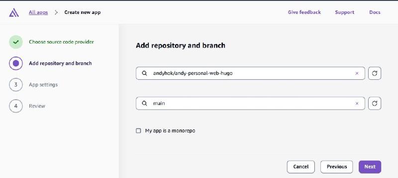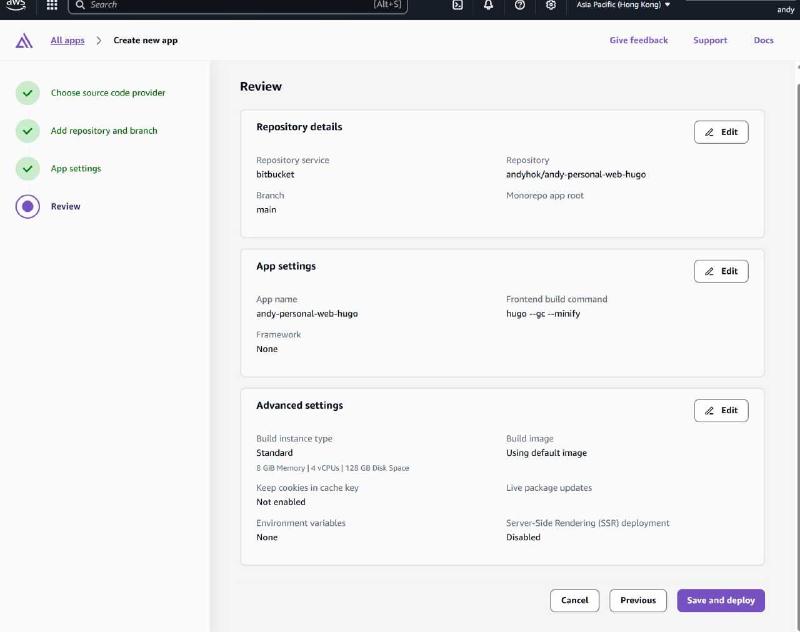 準備好上述預備步驟之後,就可以開始設定。完成設定後,就會開啟 CD (Continuous Deployment),每當有新 Commit,AWS Amplify 就會幫你 Build 和 Deploy 新版本。不論 GitHub, BitBucket, AWS CodeCommit, GitLab, 步驟大致都是相同。
