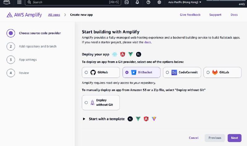 - 創建 Git Repository - AWS Amplify 支援 GitHub, BitBucket, AWS CodeCommit, GitLab 這些供應商